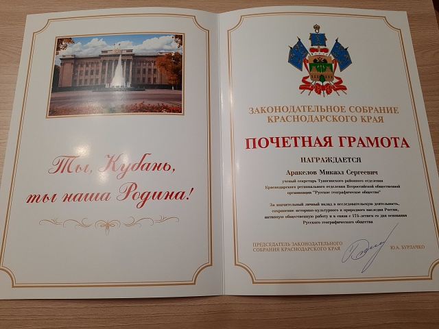 Директор филиала ФГБОУ ВО "РГГМУ" в г. Туапсе Микаэл Сергеевич Аракелов награжден Почетной грамотой Законодательного Собрания Краснодарского края.8 декабря 2020 года в г. Краснодаре, в Торгово-промышленной палате Краснодарского края состоялось заседание Совета регионального отделения Русского географического общества. На нем рассмотрели реализацию наиболее важных и социально-значимых проектов организации в 2020 году, обсудили мероприятия к 75-летию Краснодарского регионального отделения РГО. Открывая заседание, председатель Краснодарского регионального отделения Русского географического общества, член Общественной палаты Краснодарского края Иван Геннадьевич Чайка поблагодарил весь коллектив отделения за большую и активную работу, проделанную в условиях пандемии и всех связанных с этим ограничений. Он выразил надежду, что следующий год будет более перспективным, даст дополнительные возможности и Краснодарское региональное отделение РГО продолжит знаковую работу во всех подразделениях. Иван Геннадьевич Чайка отметил и наградил активных членов Общества, которые проявили себя в 2020 году. Из рук председателя Краснодарского регионального отделения РГО Почетную грамоту Законодательного Собрания Краснодарского края получил директор филиала ФГБОУ ВО "РГГМУ" в г. Туапсе, председатель Туапсинского районного отделения Русского географического общества Микаэл Сергеевич Аракелов. Иван Геннадьевич Чайка подчеркнул, что Туапсинское районное отделение РГО неслучайно было в 2013 году воссоздано именно на базе филиала ФГБОУ ВО "РГГМУ" в г. Туапсе, т.к. именно наш вуз объединил ведущих ученых-географов Туапсинского района, а научно-образовательный потенциал вуза стал ключевых фактором успехов и достижений Туапсинского отделения РГО.